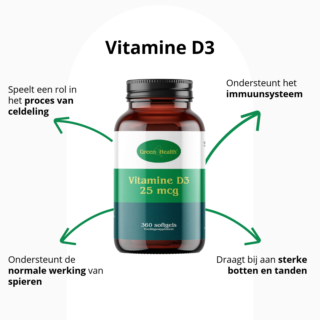 Green&Health Vitamine D3 25 mcg 360 softgels is een voedingssupplement. Een supplement